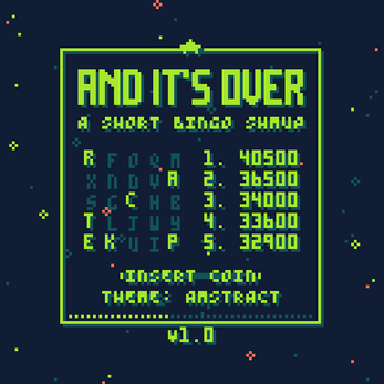 And It's Over is a single level bullet hell shmup with a nod to bonus letters from a bygone era. Back in the day, you could master arcade games by collecting the word "bonus" to get a higher score. It also features a bingo game mechanic using the bonus letters to unlock over 16 alternative color schemes.
